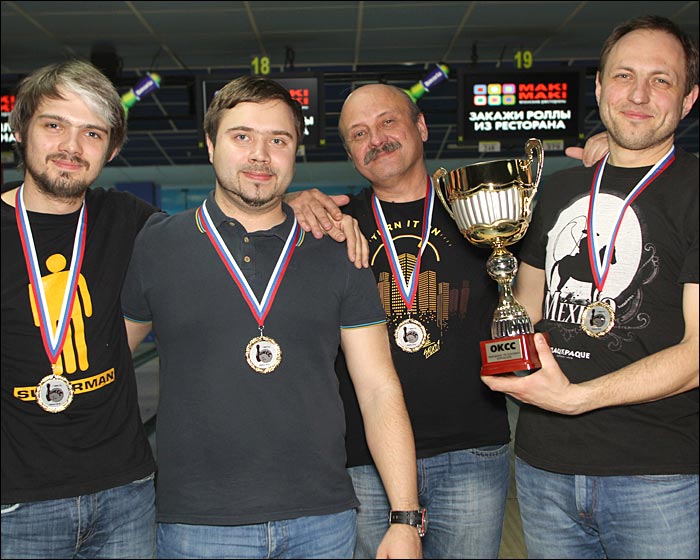 Вместе с медалями в копилку команды ушел приз за лучший результат в одной игре среди мужчин - Артем Русинов набрал 225 очков. И с одной стороны жаль, что Алексей Щербаков не смог после первой половины матча удержаться  на месте лучшего игрока этапа (по первым двум играм его средний был выше 200). А с другой стороны, надо ведь и другим командам что-то выигрывать :) К слову, малый кубок и звание лучшего игрока апрельского этапа ушли в команду "Метеорус", отличился Петр Агеев, набрав средний 195,50.